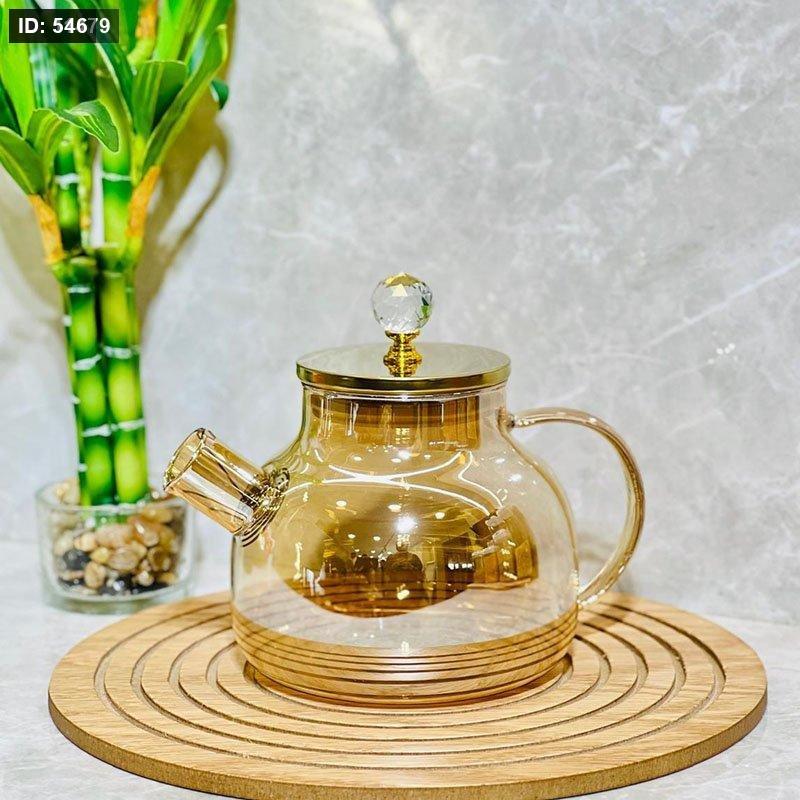 ابريق شاي 1 لتر زجاج عسلي غطا ستانلس ذهبي