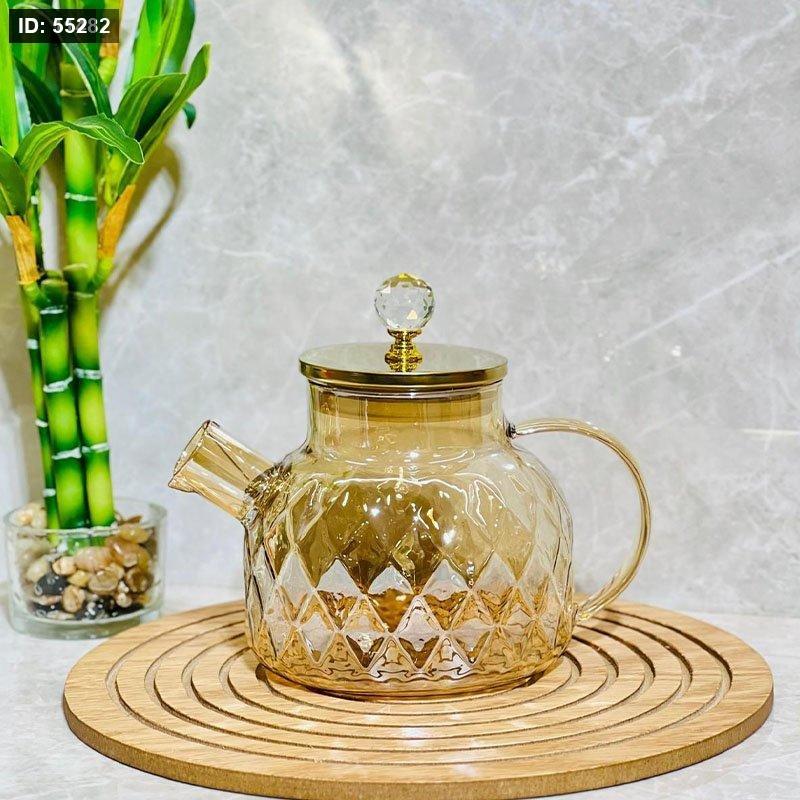 ابريق شاي 1 لتر زجاج عسلي بقلاوة غطا ستانلس ذهبي