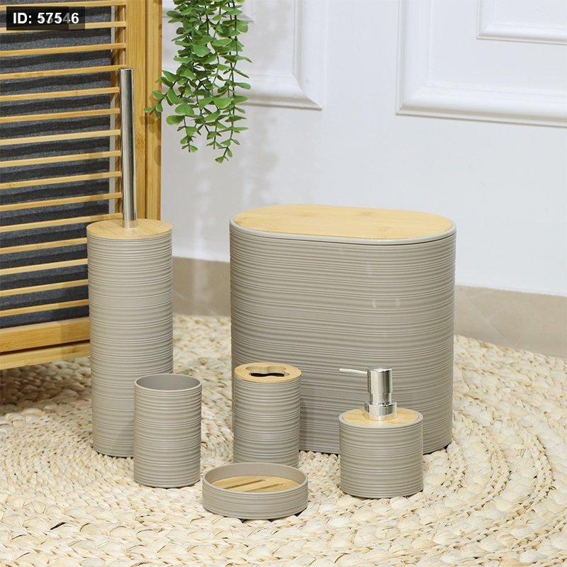 طقم حمام بيضاوي /6 بلاستك كابتشينو محزز غطا خشب