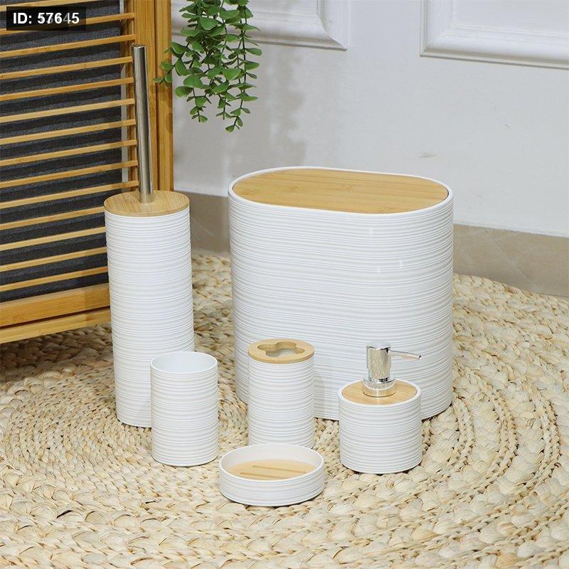طقم حمام بيضاوي /6 بلاستك ابيض محزز غطا خشب