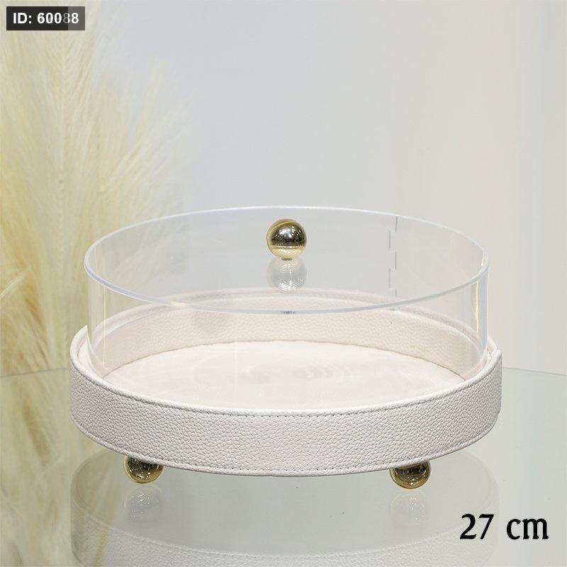 جاط كيك مدور 27سم جلد بيج غطا اكرلك شفاف مسكة ذهبي